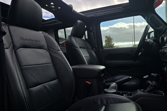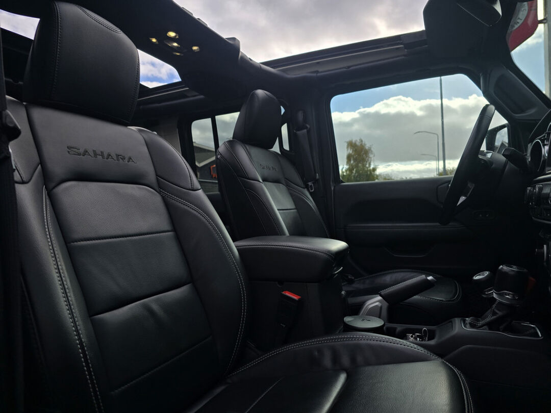 Binnenin vind je het comfort dat je van de Sahara-uitvoering mag verwachten: verwarmde stoelen, een navigatiesysteem, achteruitrijcamera en hoogwaardige afwerking. En alsof dat nog niet genoeg is, is deze Wrangler ook voorzien van een trekhaak met een trekgewicht van 1.580 kg – ideaal voor caravan, aanhanger of boot.